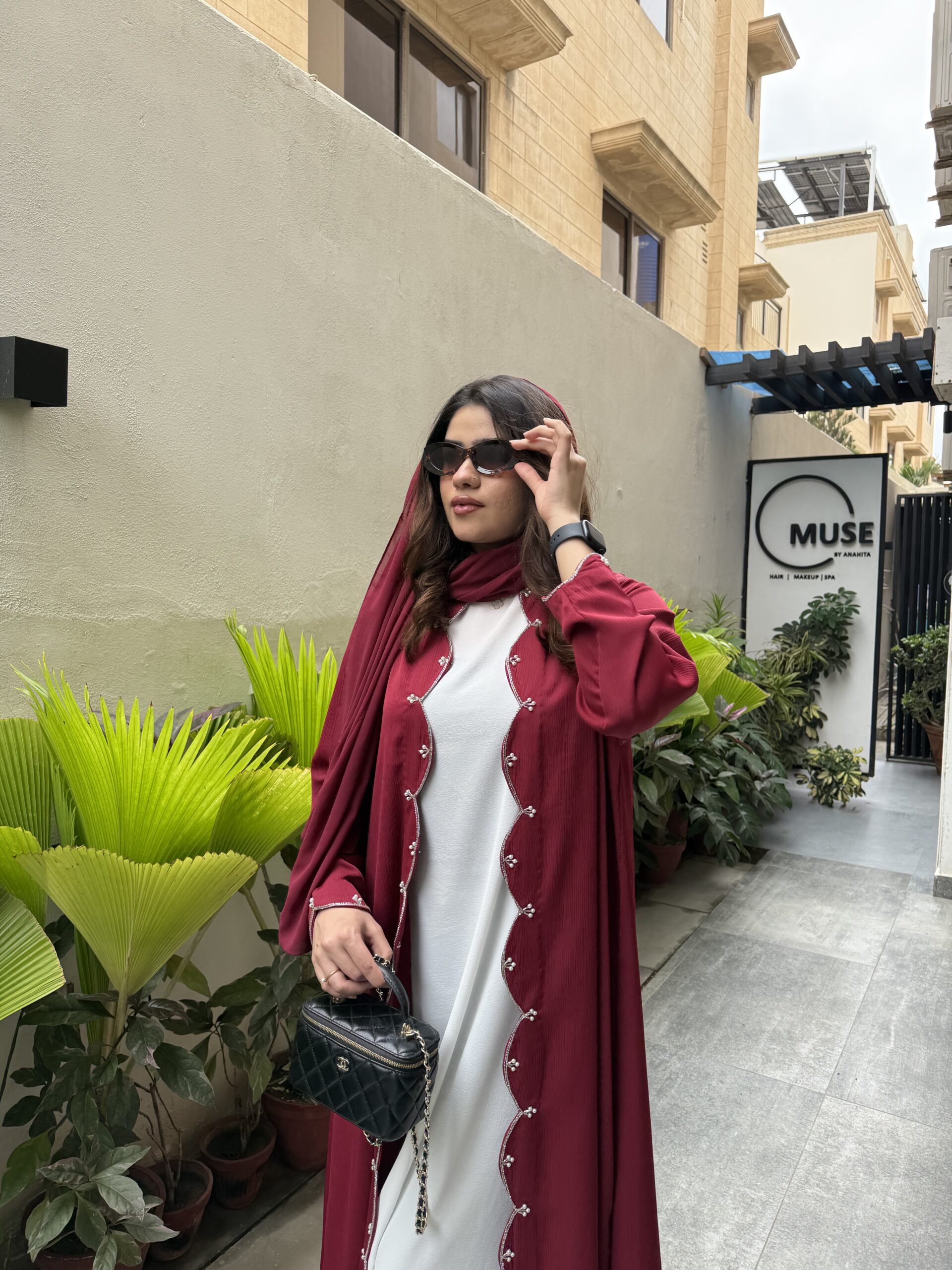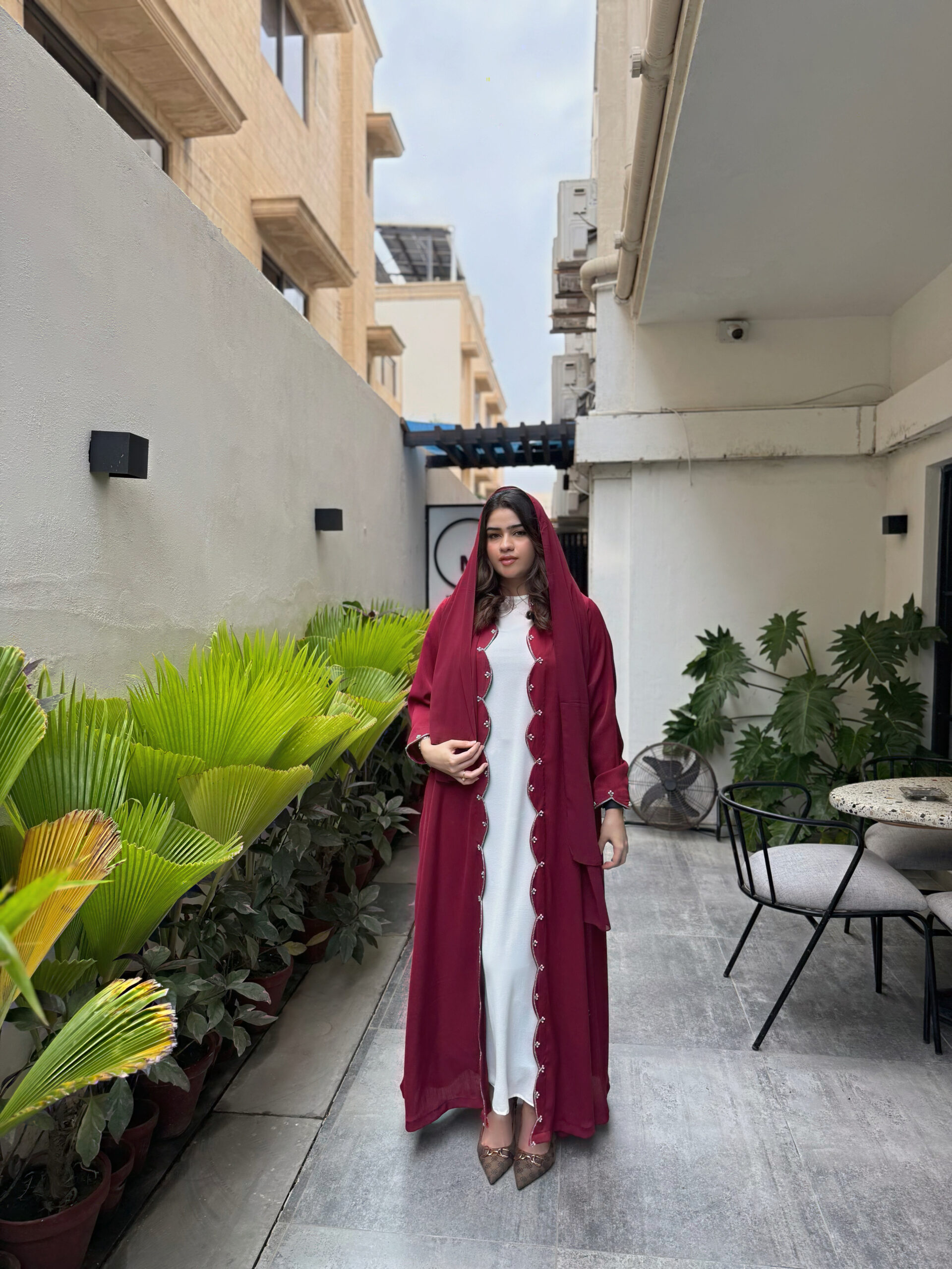 Where sophistication meets subtle artistry ✨ maroon abaya with intricate detailing — wear it open or styled with an inner.